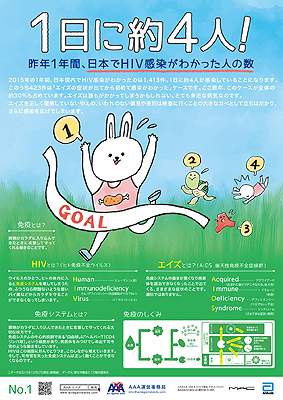 音楽業界を中心にエイズ啓発運動を展開しているAAA(Act Against AIDS/アクト・アゲインスト・エイズ)は毎年、『文化祭や学園祭、授業やイベント』などで幅広く活用できる啓発パンフレットやポスターを作成しています。最新の情報を盛り込んだ2016年版ポスターがAAA公式サイトに掲載されているのでご覧下さい。